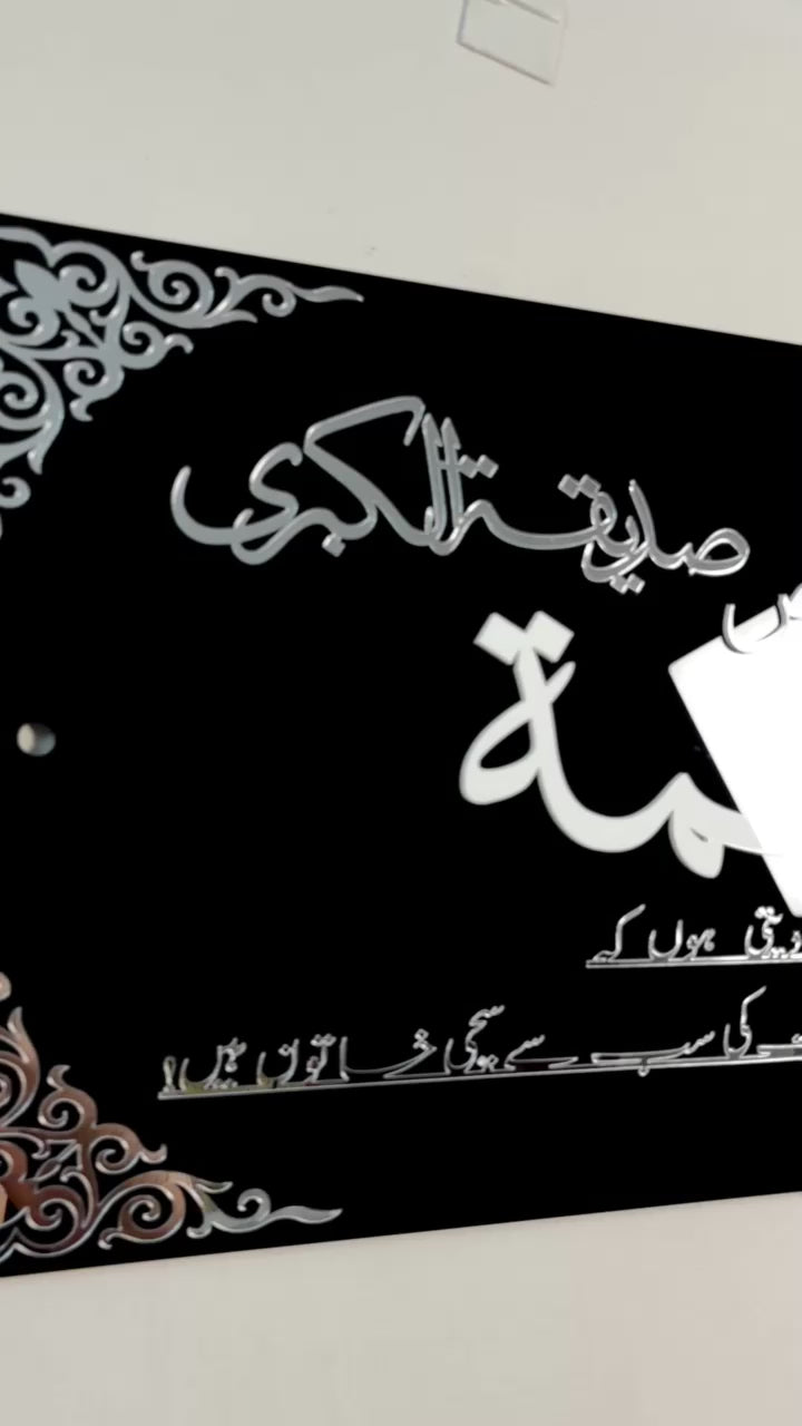 Crafted on a deep black premium acrylic base, the calligraphy is highlighted with silver mirror acrylic and white laser-cut detailing, giving the frame a luminous, elegant appearance. The intricate floral corner designs add sophistication and depth, making it a meaningful centerpiece for Majlis décor, home walls, or Islamic study spaces.