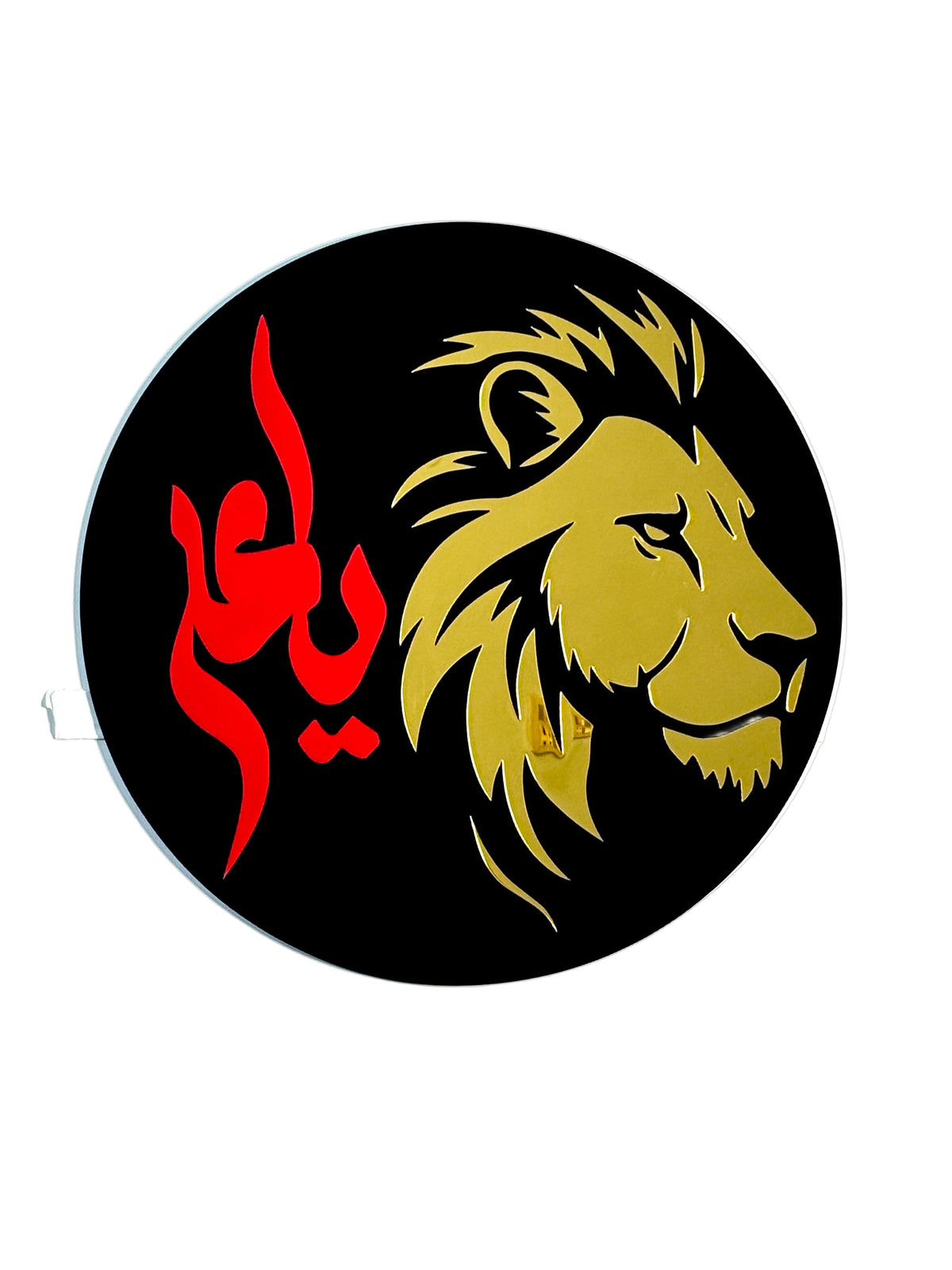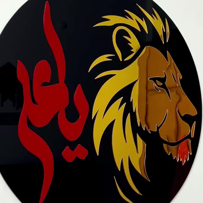 This wall art is designed with a black acrylic base, featuring red Arabic calligraphy and a gold lion motif, creating a modern yet spiritual centerpiece.